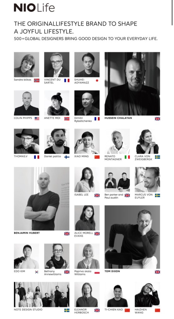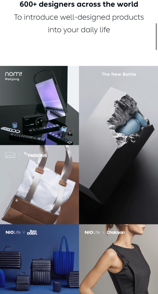 1. Nio Life 生活。蔚來電動汽車,成立十年,堅持在中國做高端品牌的熱血創始人,為了更高頻率的接觸使用者,成立了Nio Life Nio 生活。2019年至今,六年間做了超過+600以上不同產品、食衣住行都含掛。跟消費者共創理想美好生活,並建立更深刻的社群關係。